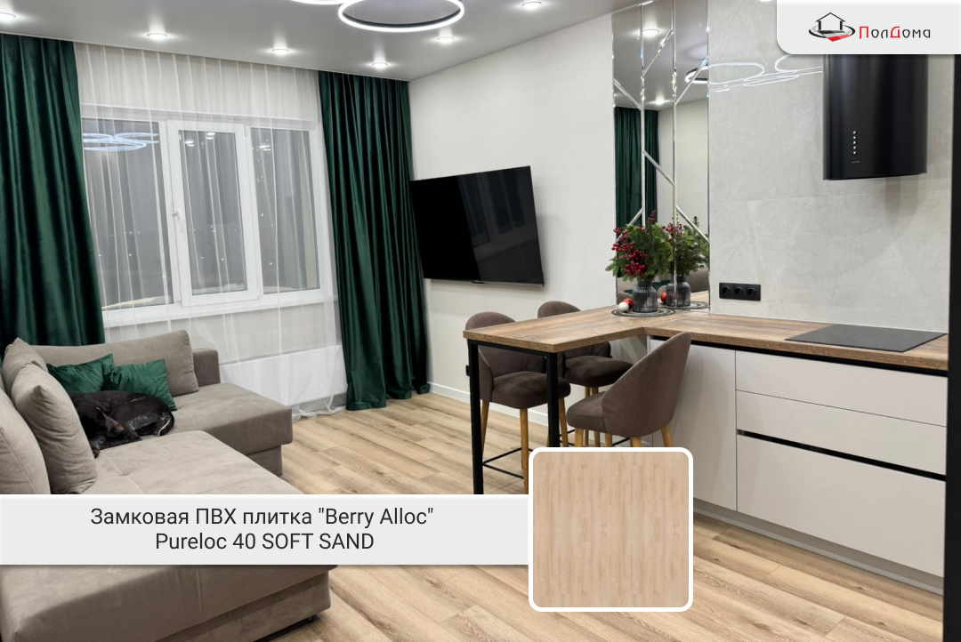 Была выбрана замковая ПВХ-плитка «Berry Alloc PureLoc Мягкий песок». Этот материал — настоящая находка для современного жилья. Он на ступень выше ламината благодаря абсолютной влагостойкости: ему не страшны ни пролитая вода, ни бытовые химикаты. Декоративный слой с высокой точностью передает теплую фактуру натуральной древесины, создавая уютную и стильную атмосферу. А специальное защитное покрытие гарантирует устойчивость к истиранию и следам от мебели.